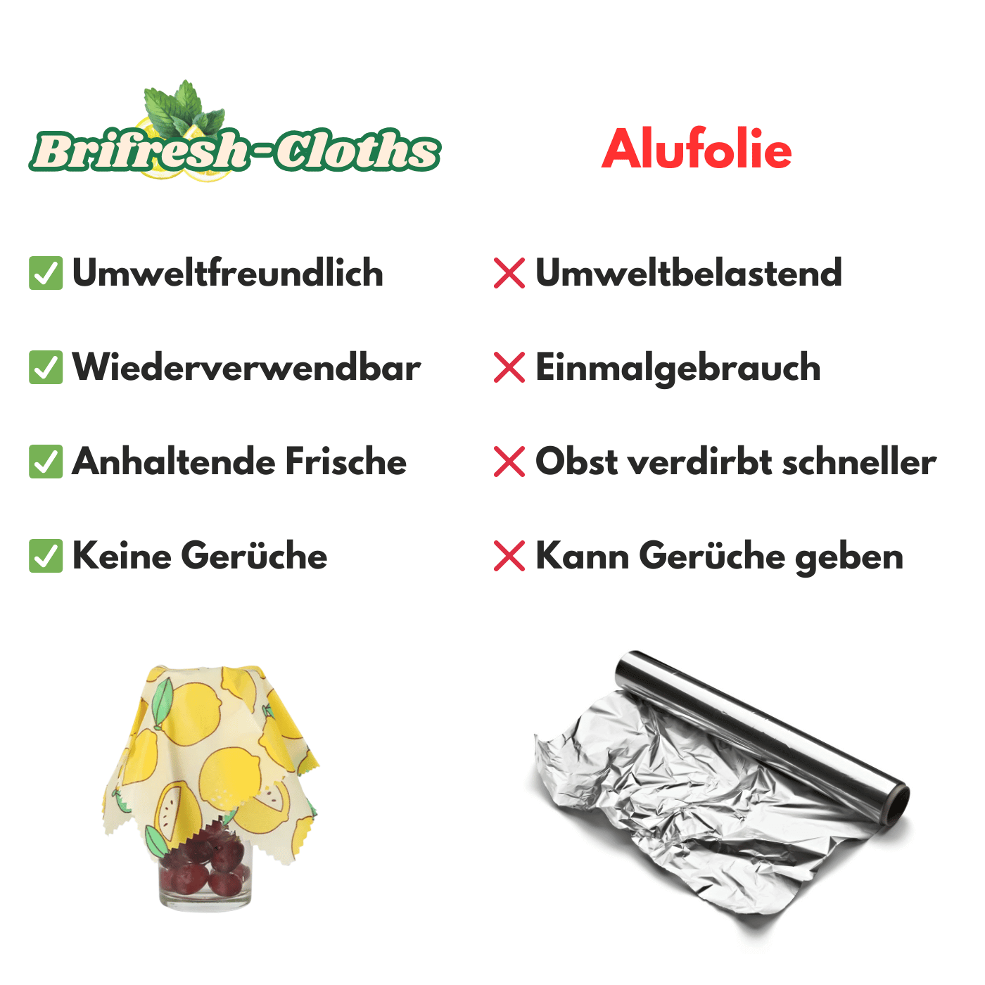 Mit unseren Brifresh-Cloths ersetzt du über 250 Meter Alufolie pro Jahr – und gibst der Frische und der Natur ein Stück Zukunft zurück.